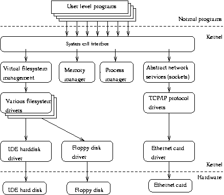 The Linux kernel consists of several important parts: process management, memory management, hardware device drivers, filesystem drivers, network management, and various other bits and pieces. Figure 3-1 shows some of them.